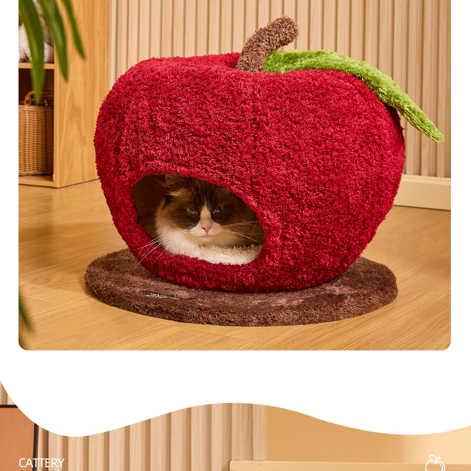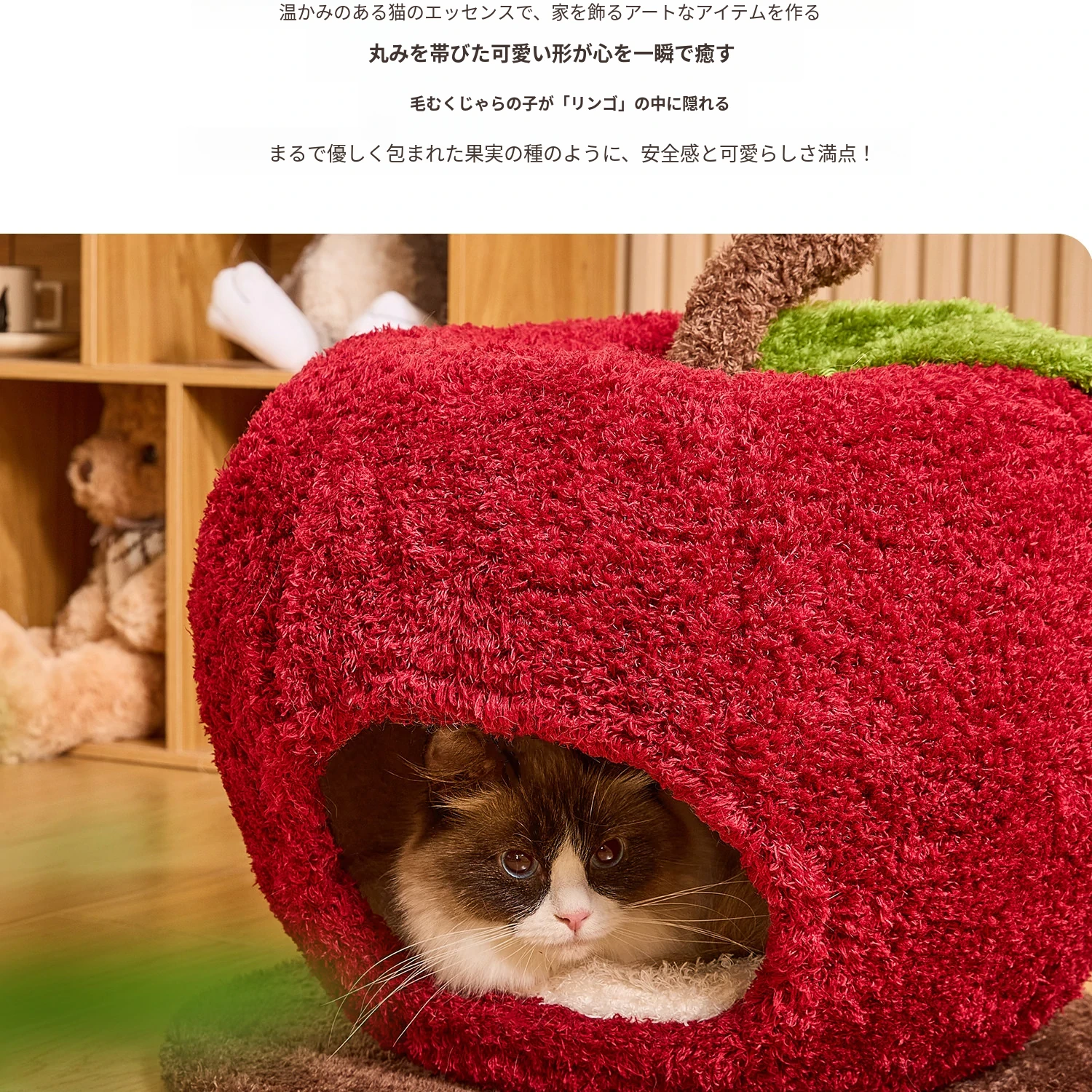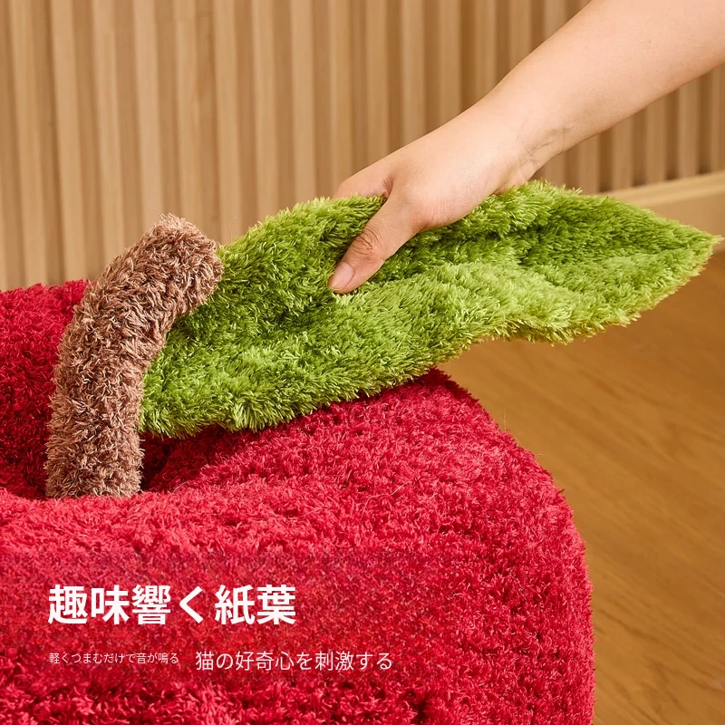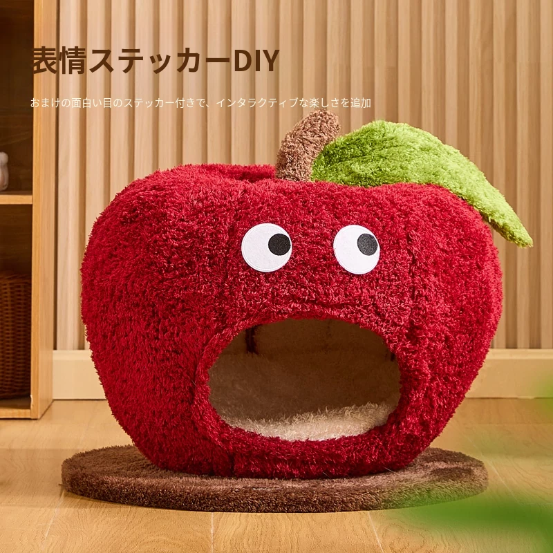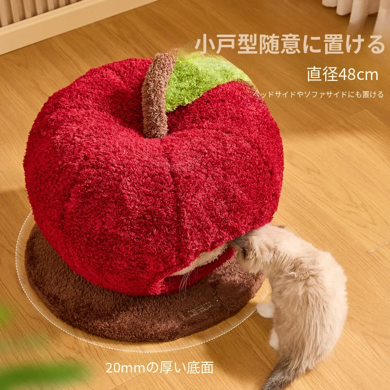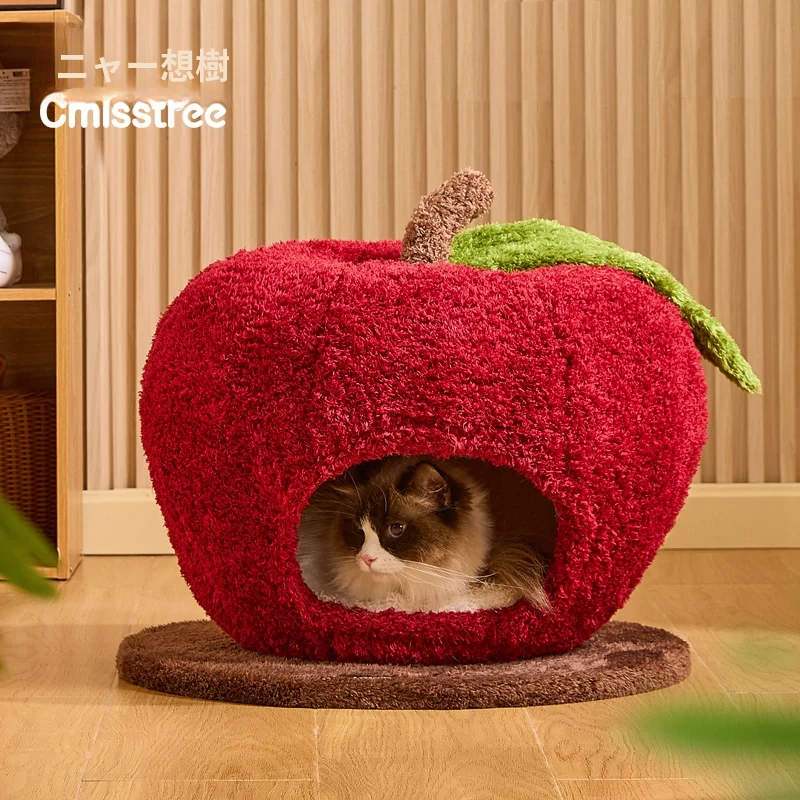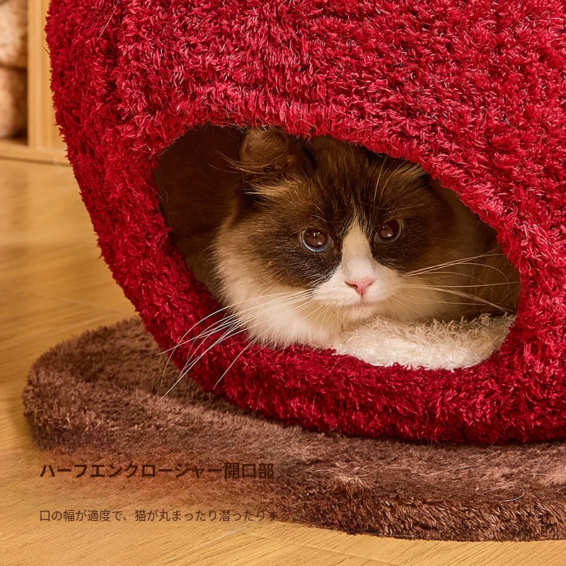 猫好き必見!可愛い封閉式デザイン「ミャオシャンツリー」アップルキャットハウス。夏でも場所を取らず、四季を通して愛猫に安心感を提供する快適な眠り空間。